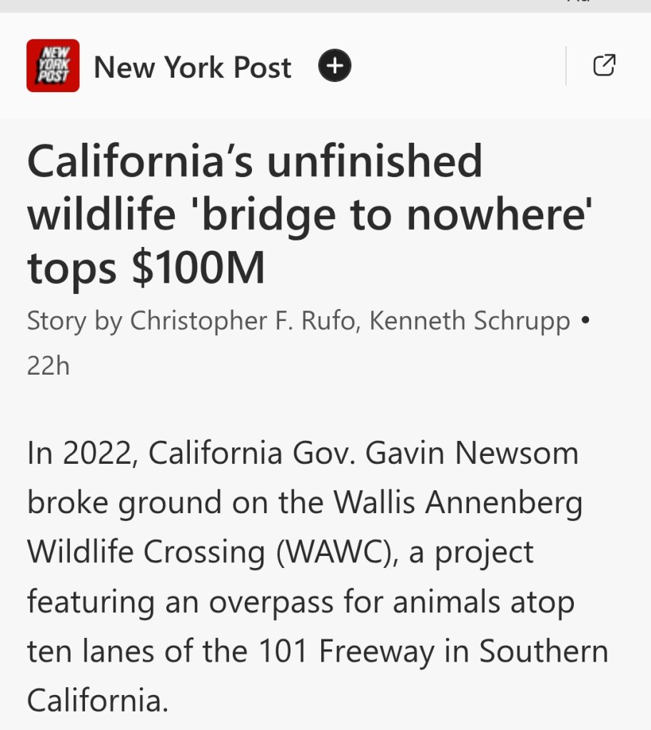 Never mind California’s own regulatory swamp, endless environmental reviews, or the rain delays everyone else acknowledges. This is classic elite virtue-signaling: virtue for the mountain lions (and butterflies), pain for working families footing the bill.