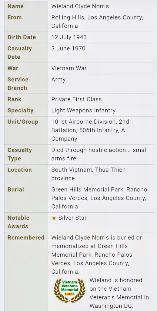 brother, PFC Wieland Norris, was killed-in-action on June 3, 1970 in Thua Thien-Hue, Vietnam while serving with A/2-506th Infantry.