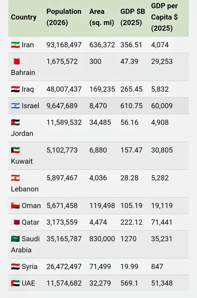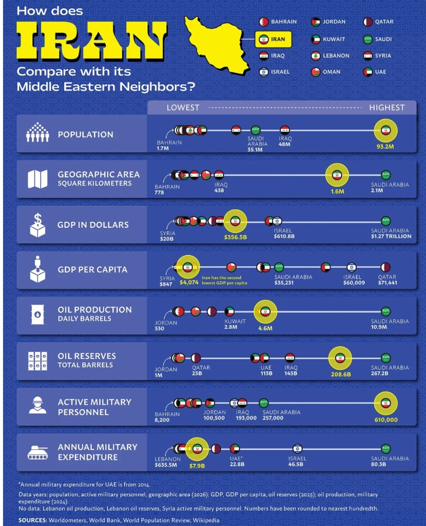 By population, energy resources, and military size, it ranks among the region’s largest players, yet it falls behind wealthier states on economic output per person and defense spending.