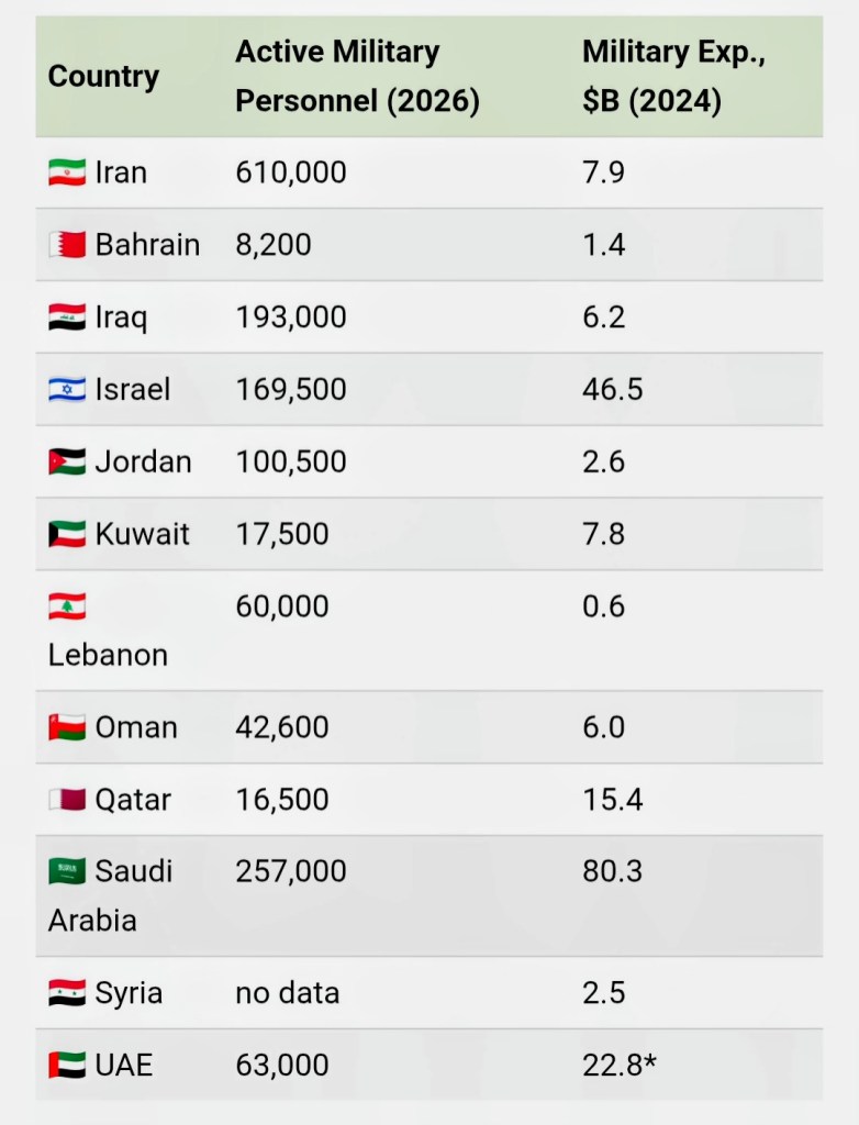 Iran has the largest active military force in the Middle East region at 610,000 personnel, which is more than double Saudi Arabia’s.