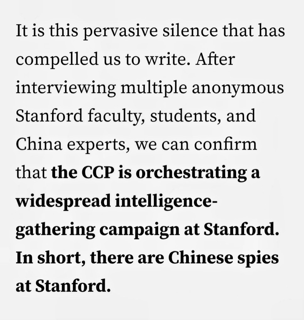 This is not some isolated incident. It’s part of Beijing’s aggressive campaign to infiltrate America’s best schools, steal research, intimidate critics, and silence anyone who dares expose them. The FBI has confirmed the threat is real, yet elite institutions like Stanford drag their feet and prioritize appeasement over student safety.