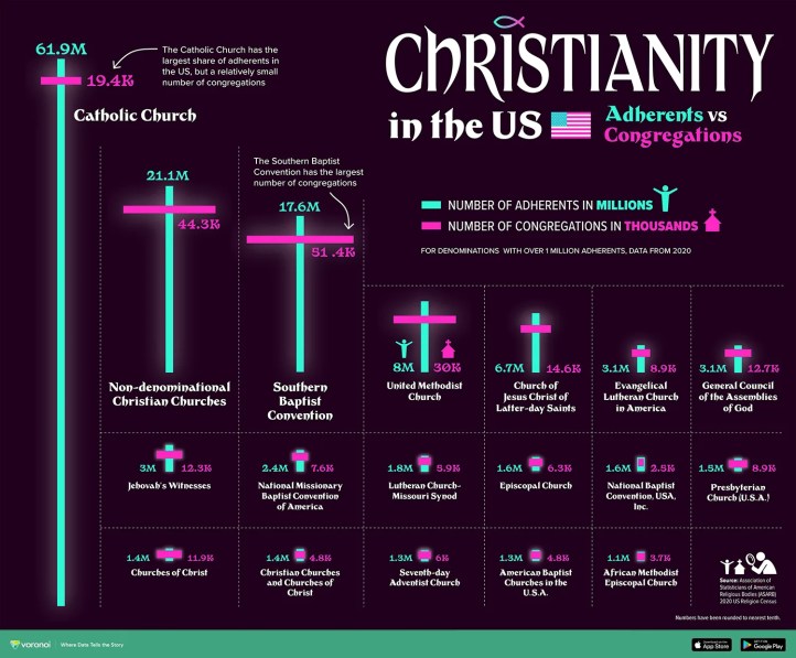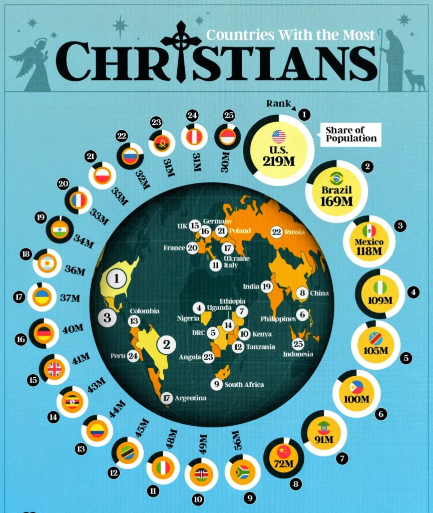 The visualization compares the 25 countries with the largest Christian populations. It reveals how demographic trends, migration, and conversion have shaped Christianity’s current global footprint.