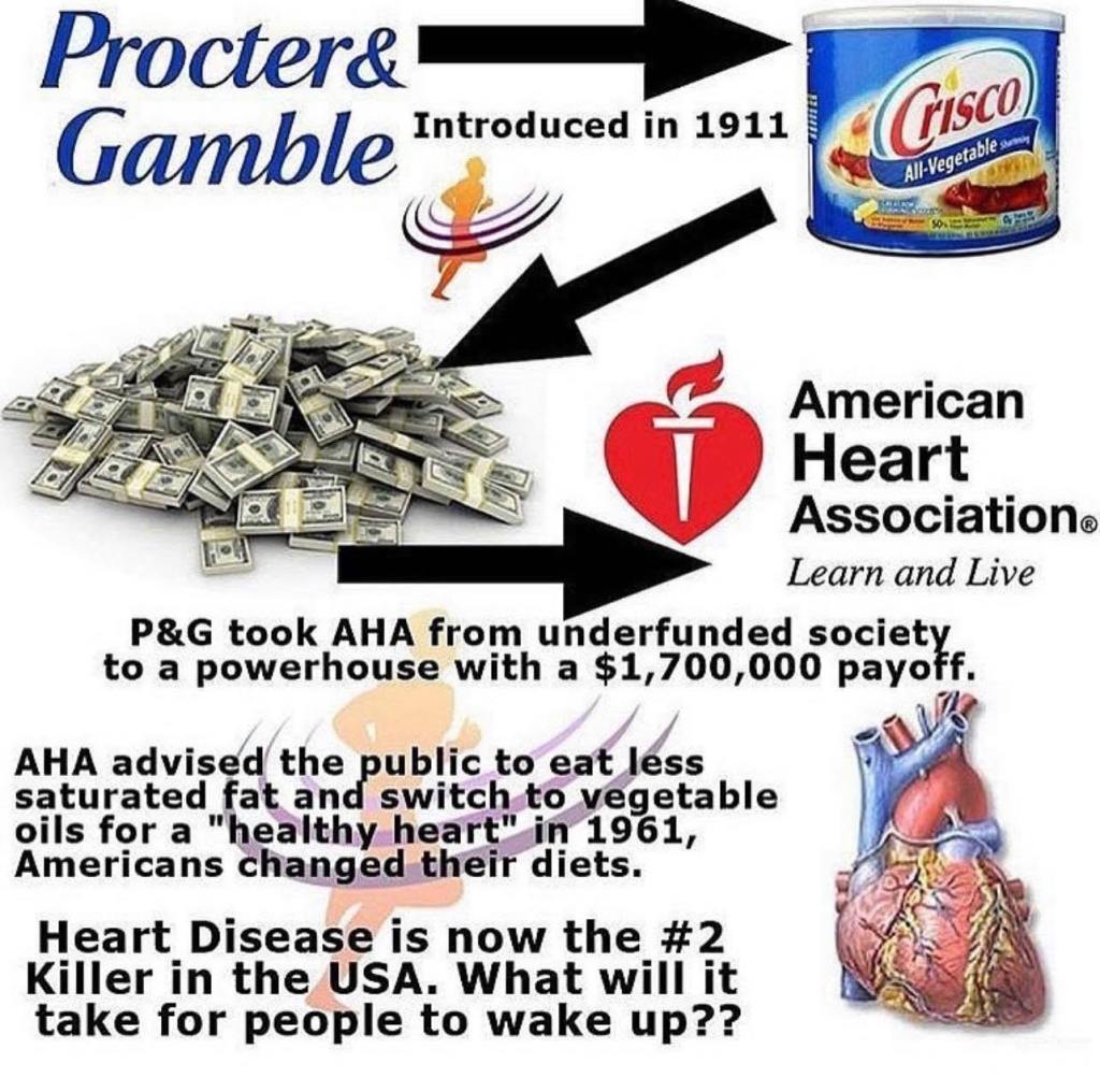 The American Heart Association (AHA) got behind the health claims in the early 1960s, recommending Crisco and other unsaturated seed oils because of their ability to lower cholesterol.