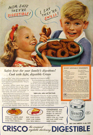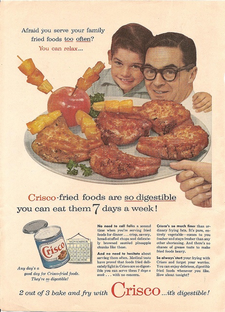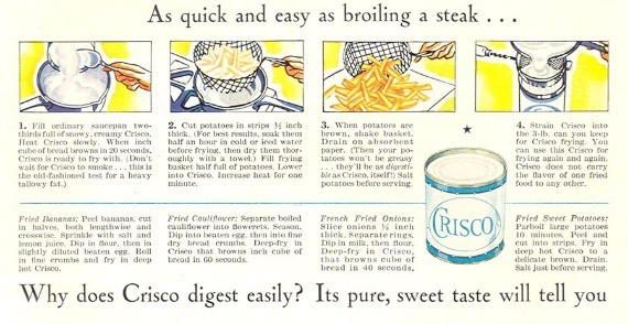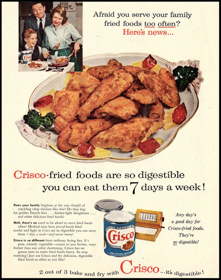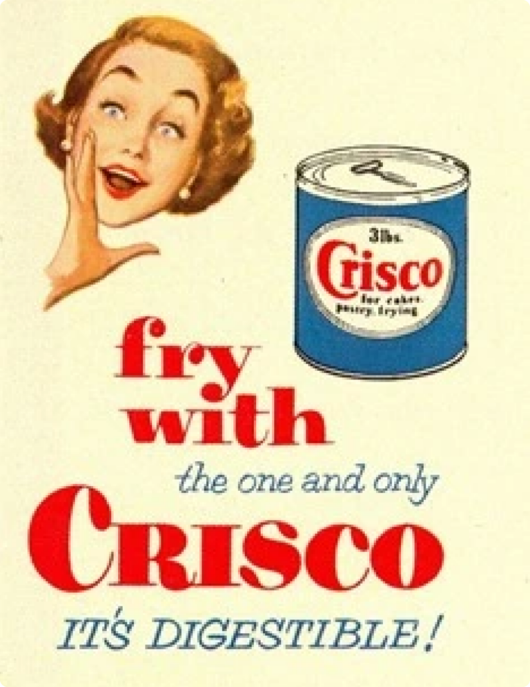 Crisco was adeptly marketed as a more versatile butter. It could be used for frying, baking and cooking. It could be stored at room temperature. They even claimed it was easier to digest and healthier too.