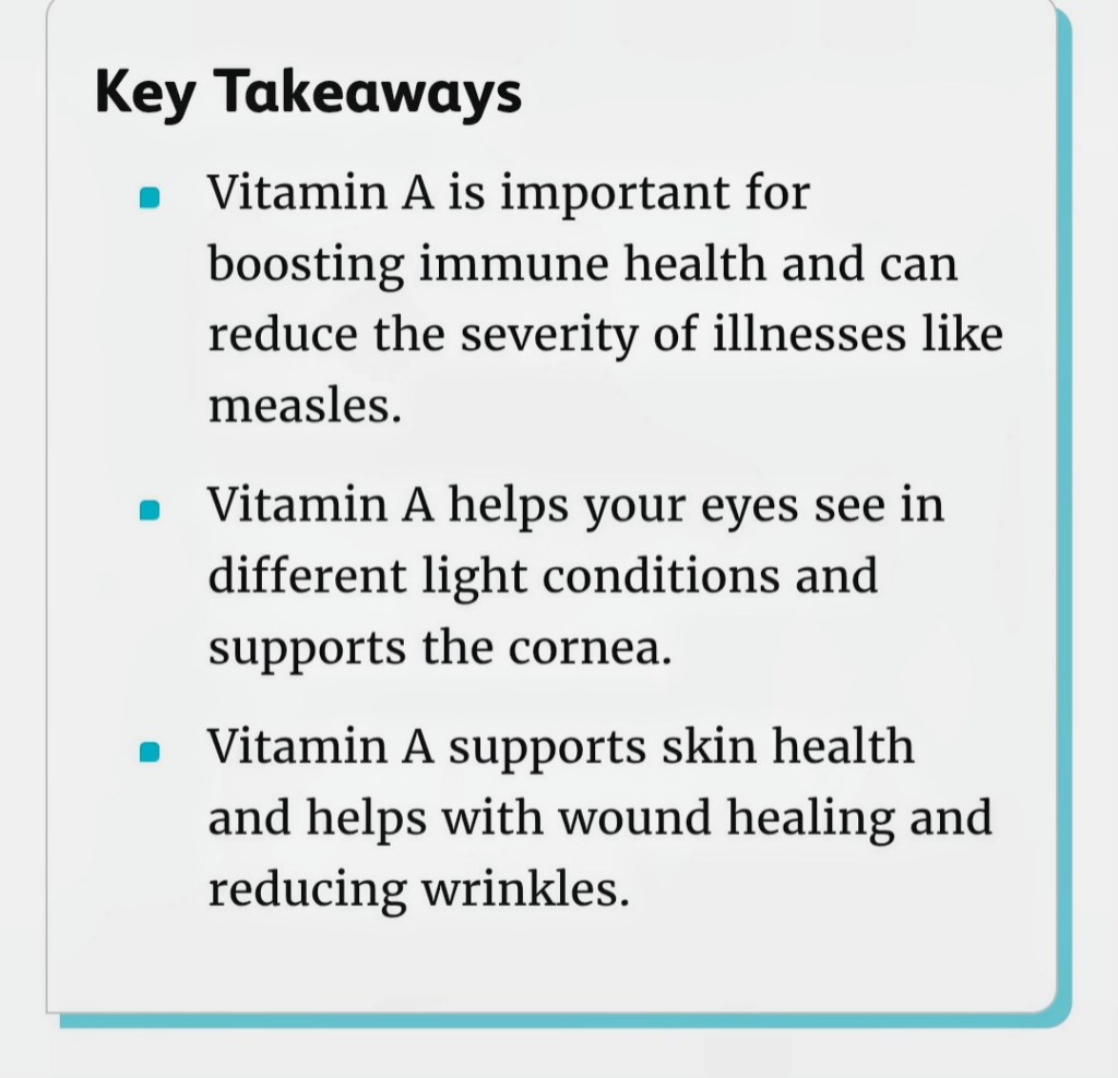 - Vitamin A plays a crucial role in the correct functioning of multiple body processes, including eyesight, cell growth, skin health, and immunity.