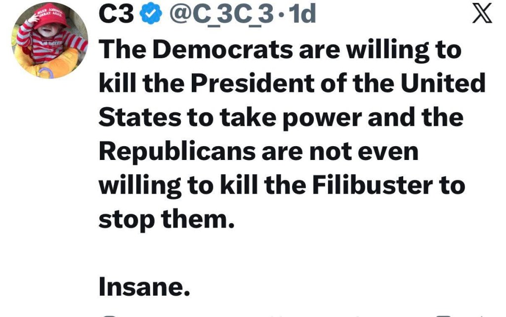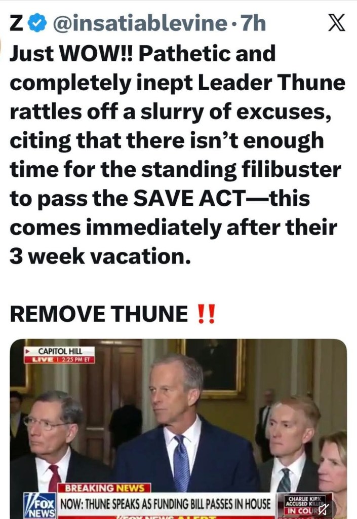 Now, knowing the longest talking filibuster in U.S. history was 60 days and that Senate leader John Thune has had over 75 days to pass the Save America Act (without any rule changes)…
